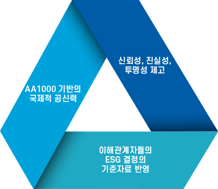 | - 포괄성, 중요성, 대응성, 영향성 준수 - AA1000 원칙 수준에 대한 근거 및 범위와 관련된 결과물 제공 |