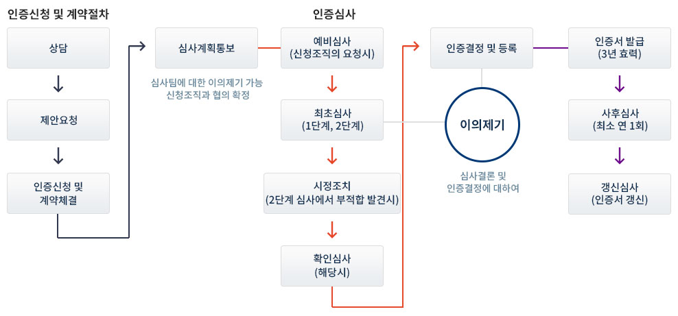 인증(적합성 평가)이란 제품, 프로세스, 시스템, 사람 또는 기관 등에 대한 규정된 요구사항의 충족여부를 제3자에 의하여 실증하여 증명서를 발급하는 것으로 그 분야의 하나로 경영시스템 인증이 있습니다. 즉, 국제표준화기구(ISO)에서 제정한 경영시스템의 인증심사(ISO 9001, ISO 14001 등)의 국제표준을 기준으로 신청 조직을 엄격히 심사하여 해당 인증서를 발급하게 됩니다.제3자 기관으로부터 엄격한 심사를 통하여 인증을 획득하면 신뢰감을 이해관계자에게 주고, 법위반을 감소 시키고 수출장벽 극복과 기업의 경쟁력 강화 등으로 지속가능한 사업을 가능하게 도와줍니다.